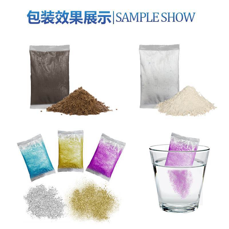 水溶膜闪粉包装机顾名思义包装物料是:闪粉。水溶膜是目前比较新型的环保材料,成品遇水可以溶解,对环境没有污染。闪粉也有一个特性,又飘、又粘。这款设备是专为此物料而设计。