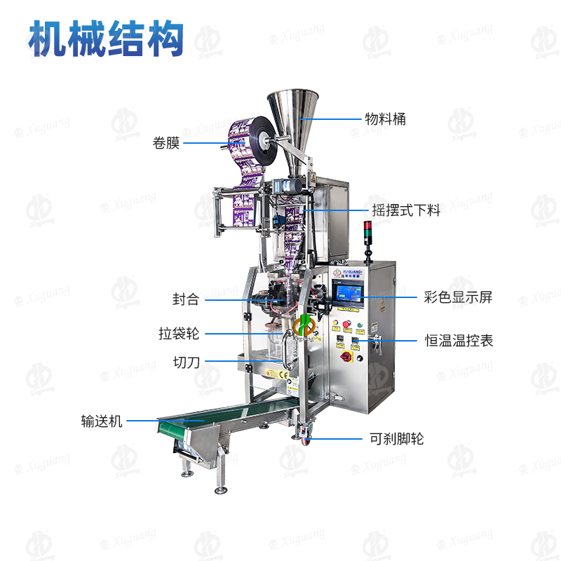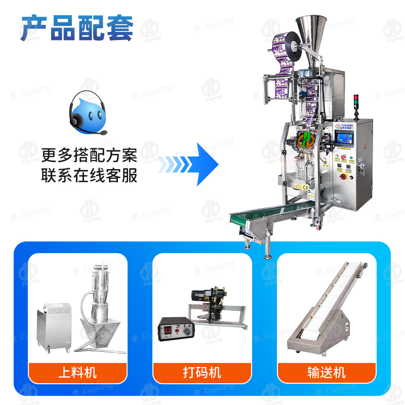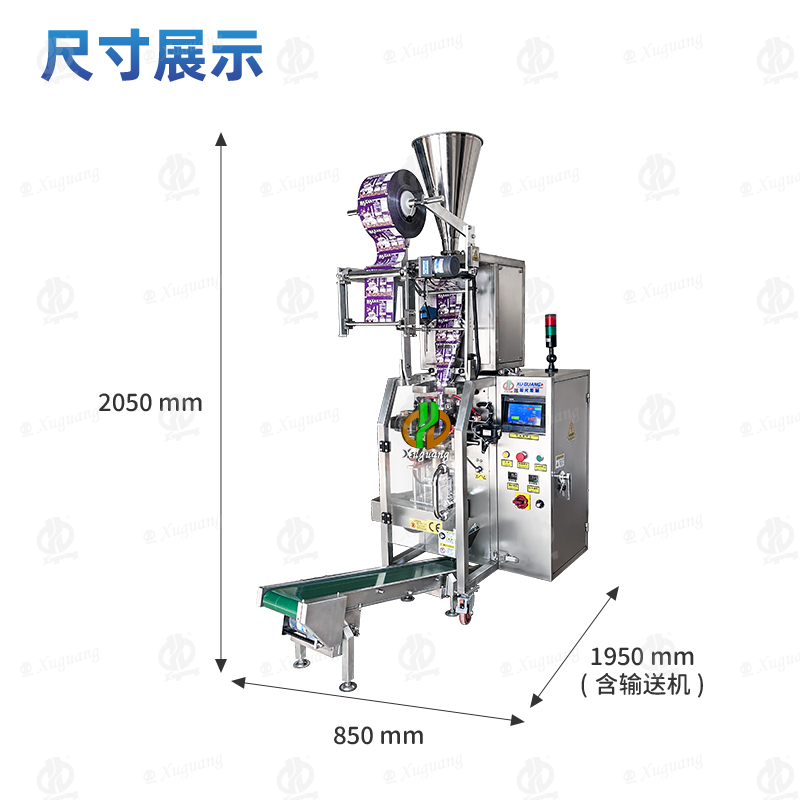 整体机身,采用了优质不锈钢材料,而所有与您产品直接接触的部分包括:料仓、计量料杯、下料斗、成型器等,我们采用食品级304不锈钢材质。设备自带报警系统,缺膜缺料自动报警。整机高1.8米,可搭配自动上料机,上料方便,生产稳定,不需要员工随时监控,设定好参数就可以了。