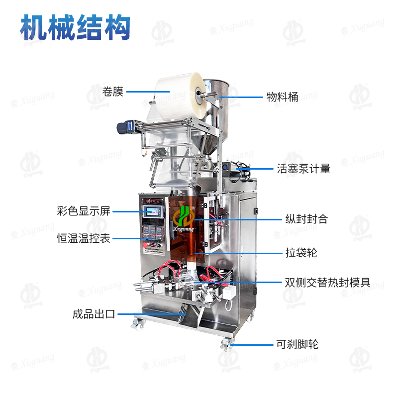 3.该设备采用智能彩色操作显示屏,操作人员只需一键选择即可完成设备调整。特制活塞泵下料,计量精准,不滴料不漏料。设备可自动完成计量、制袋、灌装、封合、打印批号、生产日期、有效期、计数等一系列工作。