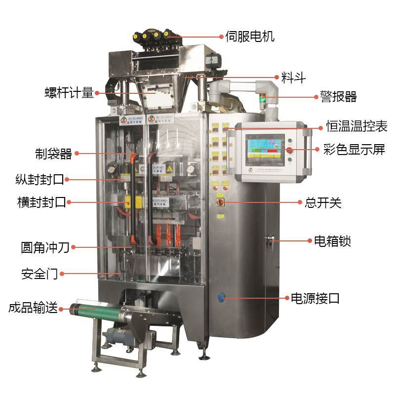 5.设备内部结构布局合理,线缆编号清晰。当需要维护时,能实现故障快速定位与检修,较大限度地缩短停机时间,保障生产线的连续高效运转。智能能温控系统,0-999度可调节,适用于复合膜、纸塑膜、铝膜、无纺布等各种包装材料,能满足各行各业的产品包装需求。机器长1.7米,宽1.5米,高2.5米,可搭配自动上料机,上料方便,生产稳定,设备的料仓、计量装置、下料斗等所有接触物料的部件,均采用模块化快速拆卸设计,可用清水冲洗或毛巾擦拭,确保无卫生死角。