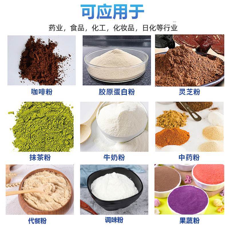 1. 设备适用于多种行业:像食品中的辣椒粉,胡椒粉等产品、药业中的灵芝孢子粉,石斛粉,鹿角粉等,保健品胶原粉等。化妆品中的冻干粉等产品都可以全搞定!