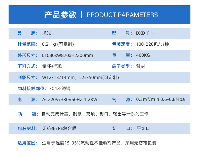 - 袋型标准:背封袋,封口美观牢固