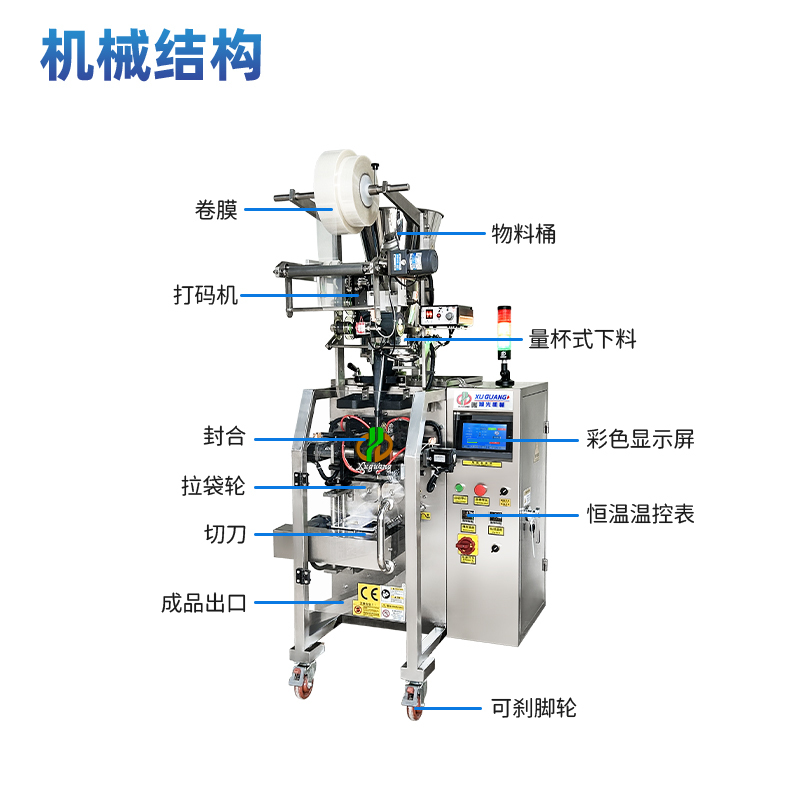 3.设备都可以连续自动完成计量、制袋、灌装、封合、打印批号、生产日期、有效期、计数等一系列工作。