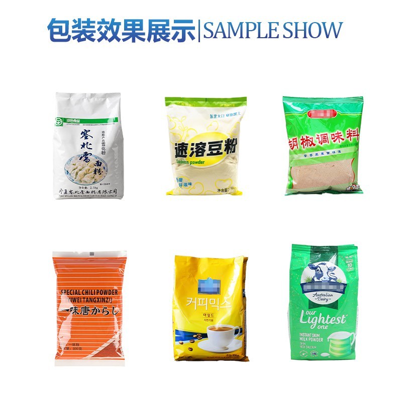 1.生活中见到大袋装的面粉、淀粉、奶粉、代餐粉、调味粉、五谷杂粮粉都适用720粉末包装机。