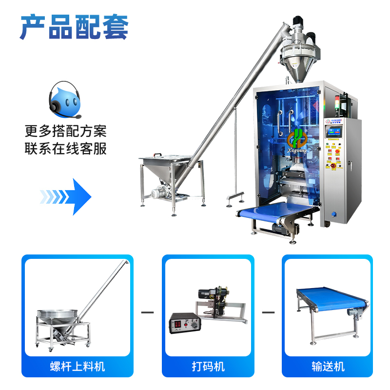 6.720粉末包装机还可无缝配套上料机 + 打码机 + 输送机:上料机实现物料自动上料,替代人工投料,降低劳动强度;打码机可在包装袋上打印生产日期、批号、保质期等信息,满足产品溯源需求;输送机完成成品袋自动输送,衔接后续装箱、码垛工序,真正实现从物料上料到成品出库的全流程自动化,大幅提升生产效率,降低人工成本。