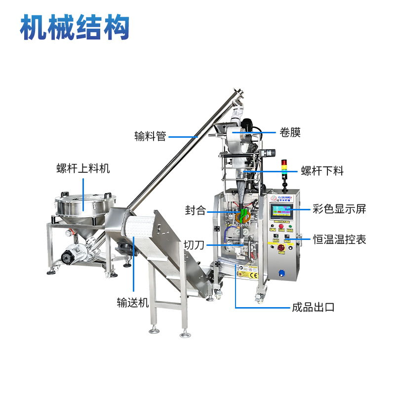 2.高精度螺杆下料,30–50 包 / 分钟,8 小时可产 25000 包,误差 ±0.2g,杜绝缺量、超重;螺杆有三倍调节范围,超出可通过换螺杆来完成,一机多用。