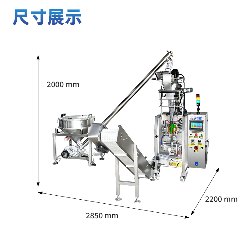 4.水溶膜清洁粉包装机长0.9米,宽0.8米,高1.7米,可搭配上料机,输送机协助生产。设备采用全封闭防尘结构料桶,可减少车间扬尘问题,保护工人健康。