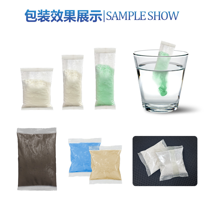 专为清洁粉、漂洗粉、消毒粉,洗衣粉等日化粉剂类产品定制水溶膜清洁粉包装机。