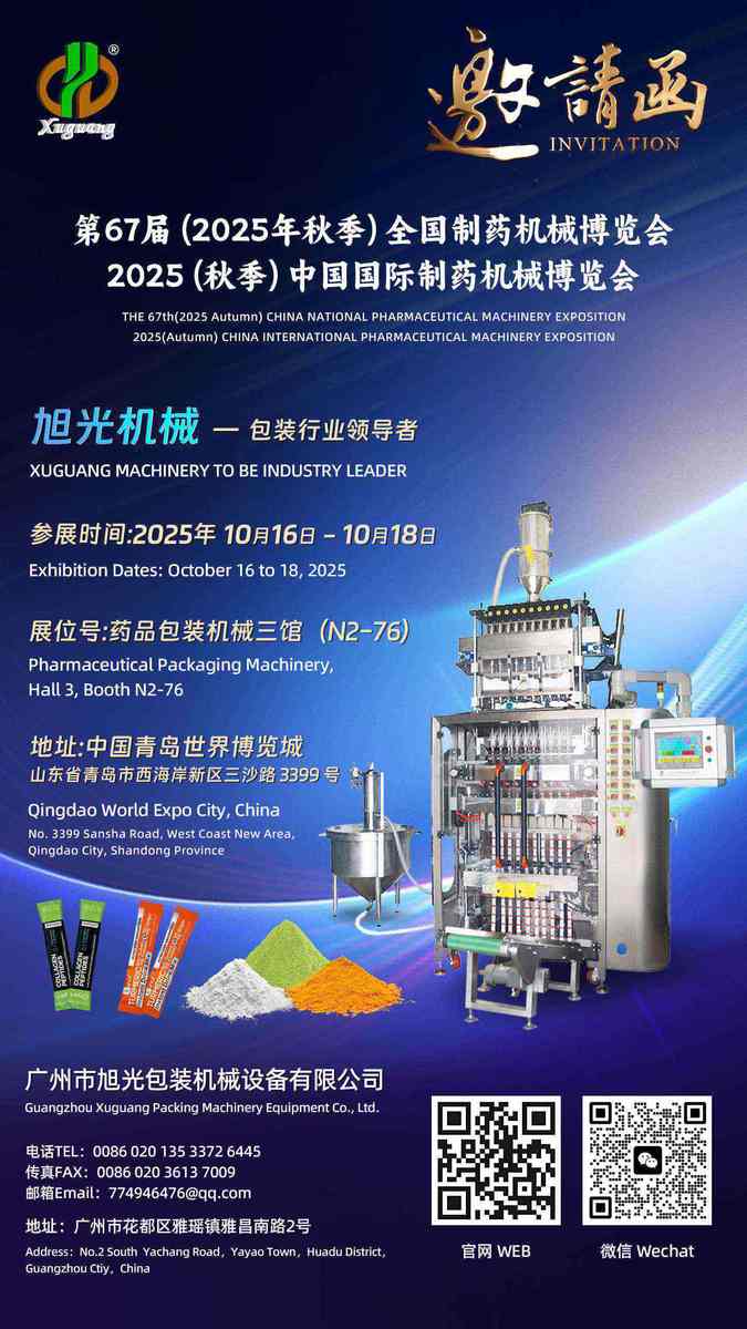 第67届(2025年秋季)全国制药机械博览会&2025(秋季)中国国际制药机械博览会将在青岛举办,广州旭光包装机械也在参展行列,热烈欢迎来自世界各地的友人前来参展!!!